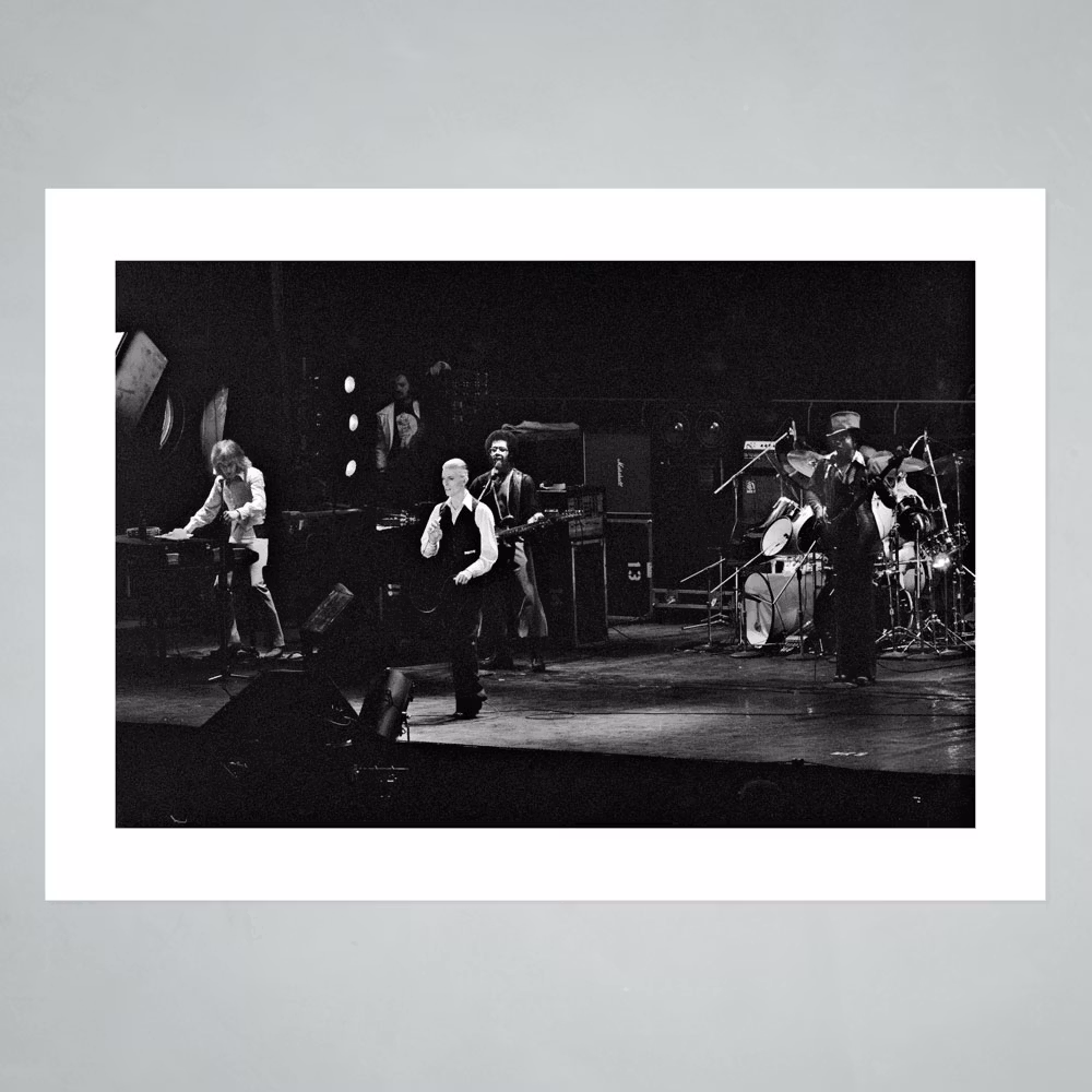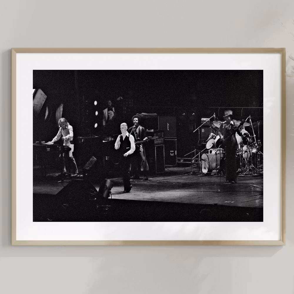 Bowies konsert i Kungliga Tennishallen 1976. Fotograf Per Asplund. Storlekar 30x40 och 50x70 cm. Vit kant kan variera något mellan formaten.
