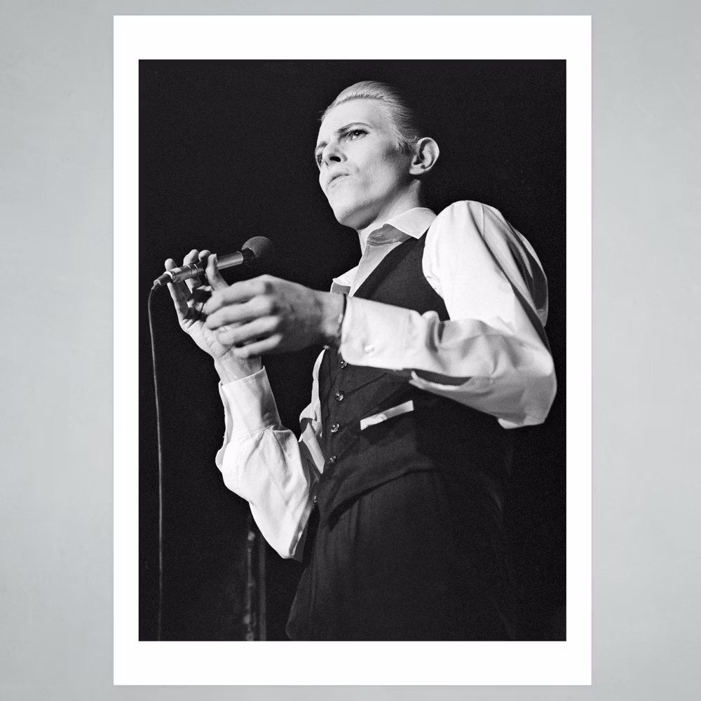 Bowies konsert i Kungliga Tennishallen 1976. Fotograf Per Asplund. Storlekar 30x40 och 50x70 cm. Vit kant kan variera något mellan formaten.