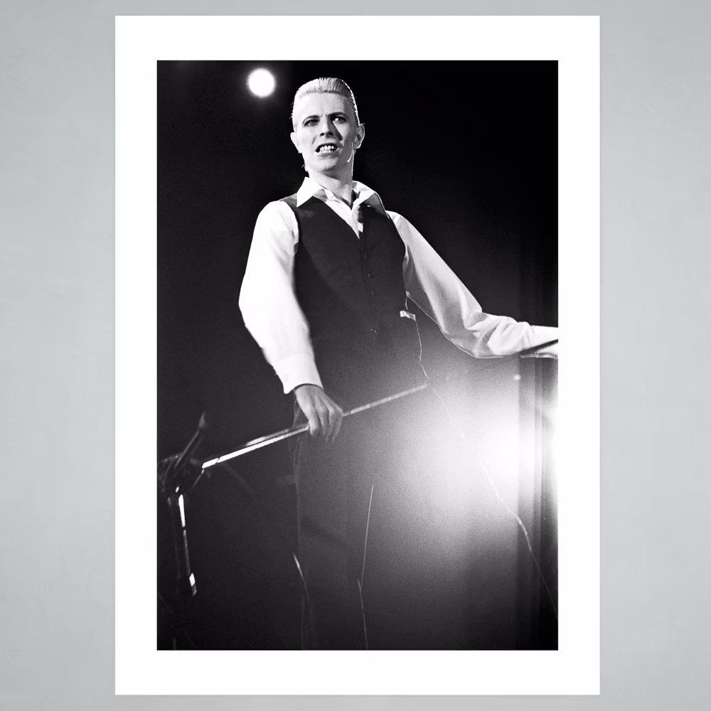 Bowies konsert i Kungliga Tennishallen 1976. Fotograf Per Asplund. Storlekar 30x40 och 50x70 cm. Vit kant kan variera något mellan formaten.