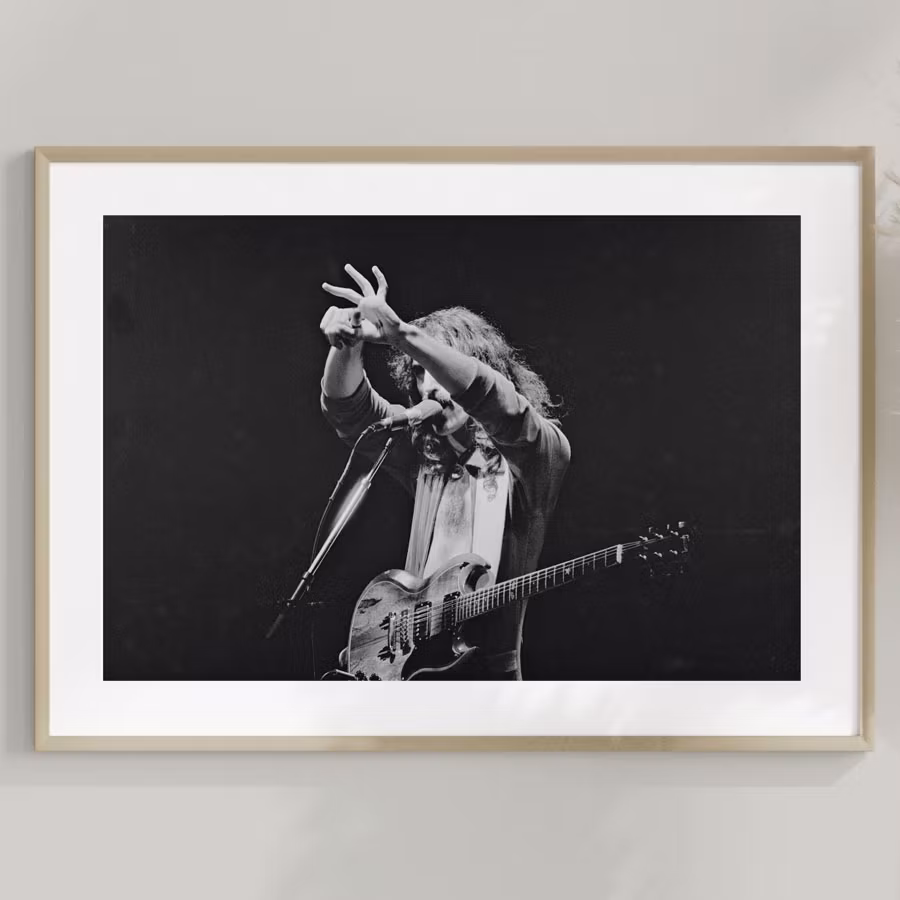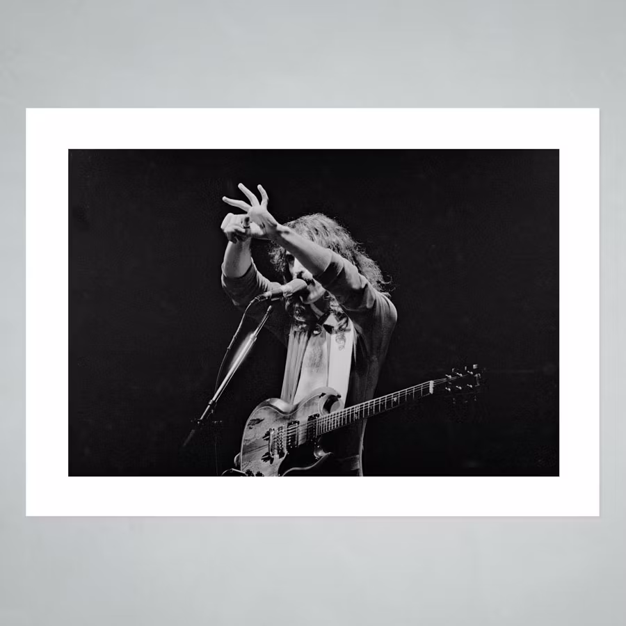 Frank Zappa på Konserthuset i Stockholm 1976. Fotograf Per Asplund. Vit kant. Välj storlek och papper.